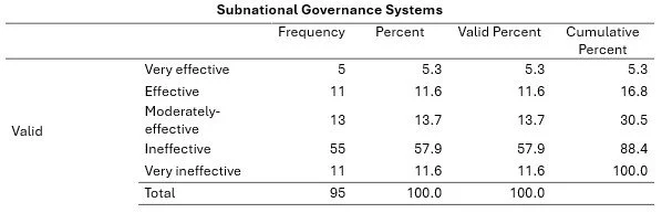 Thus, the study sought to assess whether subnational governance structures—such as county administrations, traditional authorities, and local peace committees—are effective in managing resource-related conflicts. Out of 95 respondents—majority of whom live and work outside the capital, Juba—5 (5.3 percent) selected very effective, 11 (11.6 percent) effective, 13 (13.7 percent) moderately effective, 55 (57.9 percent) ineffective, and 11 (11.6 percent) very ineffective. The results are illustrated in Table 4.