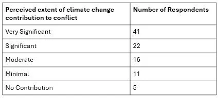 The responses reveal a strong majority in agreement of the role climate change plays in exacerbating local conflicts. One policymaker, with visibility into nationally-aggregated data, in Juba stated: